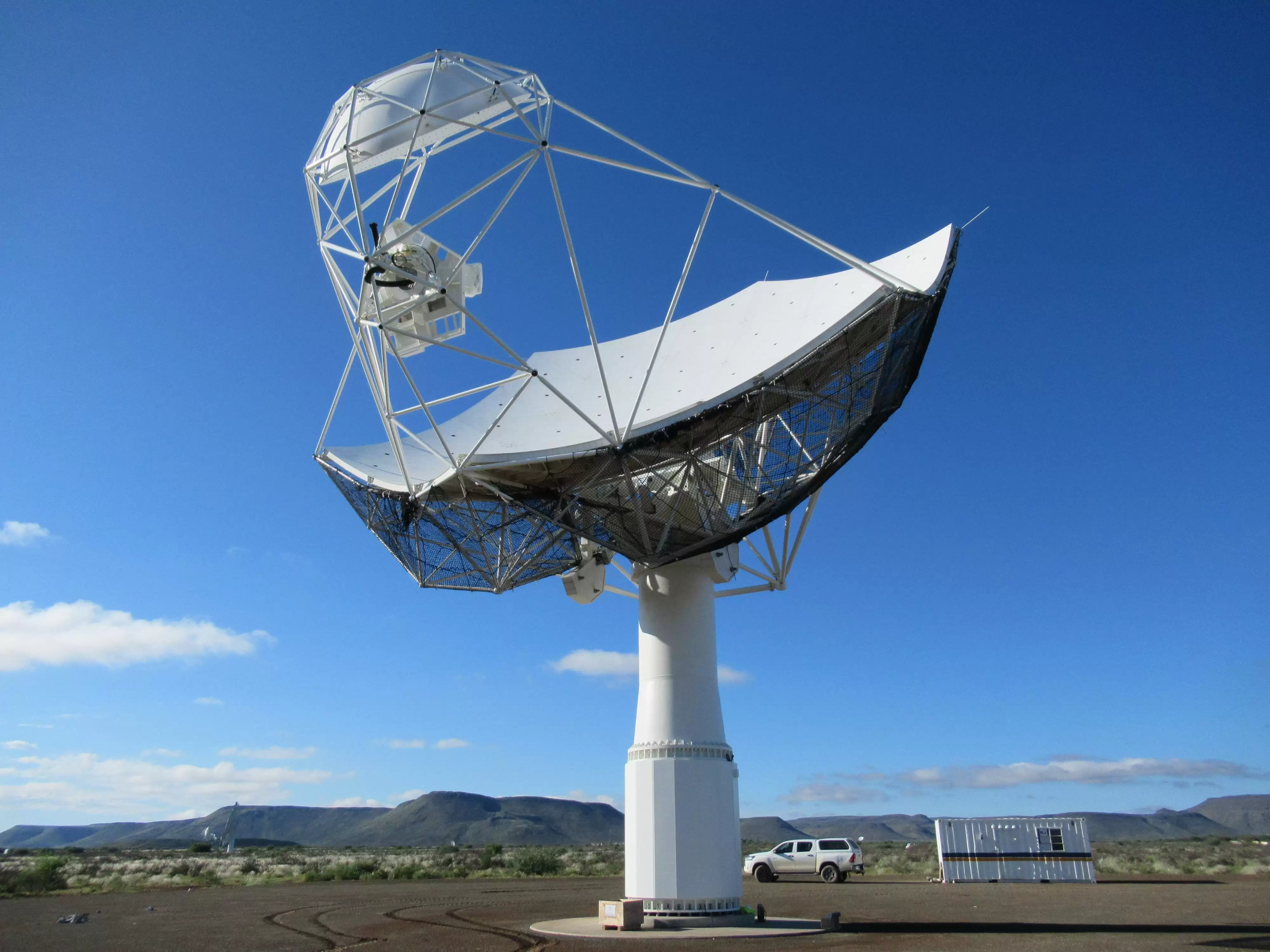 镜头那边,早上七点的南非卡鲁荒漠,湛蓝的天空下,一台台高耸的白色六边形碟状天线正缓缓转动,向宇宙发出无声的问候。