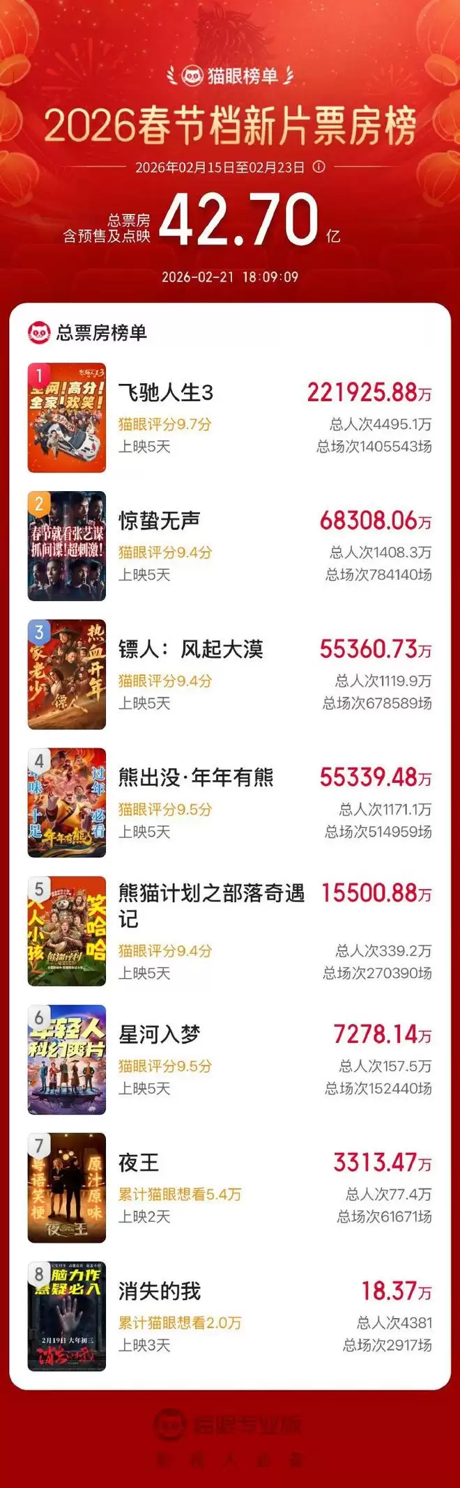 根据猫眼专业版数据显示,截至2月21日18时06分,《镖人:风起大漠》总票房(含预售)已超越《熊出没·年年有熊》,成功跻身2026年春节档新片票房榜前三名。
