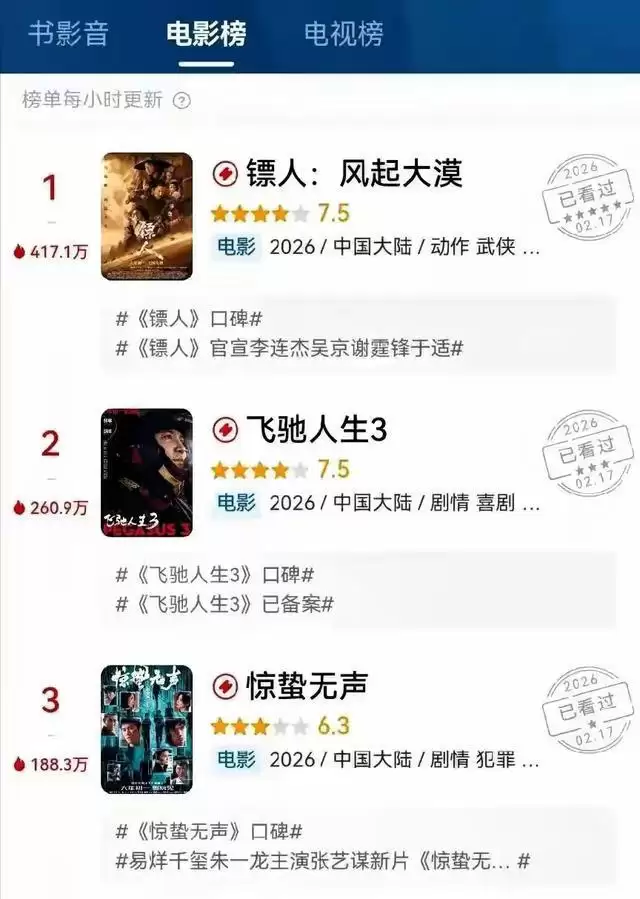 2026年春节档最热闹的舞台上,意外的戏码轮番上演。大年初四,票房榜单悄然变化,一场武侠动作片《镖人》完成了一次惊艳的反超,超过了张艺谋导演的谍战片《惊蛰无声》,从首日第四跃升至单日票房亚军,震惊业内和观众。