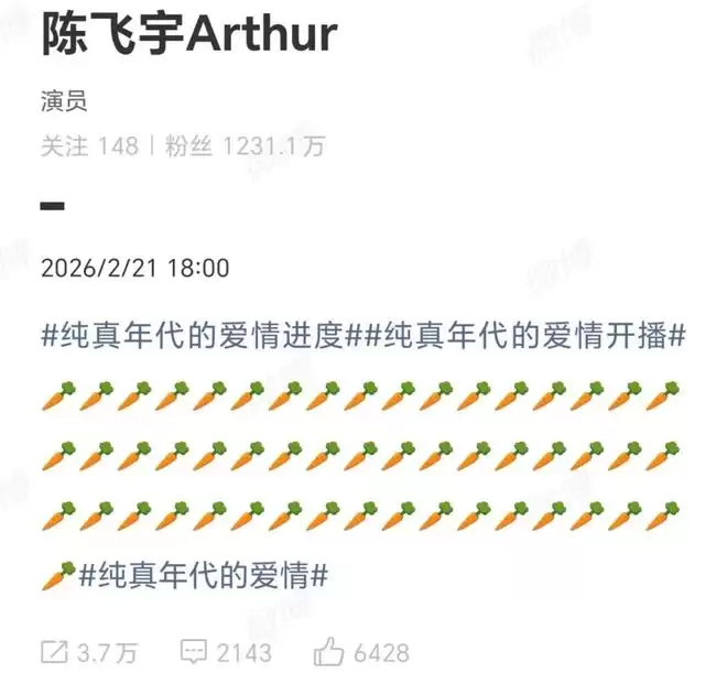 就是因为方穆扬吃胡萝卜太多,演员陈飞宇专门在个人社交平台连发了52个胡萝卜。