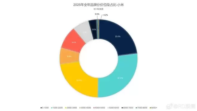 很多人面对这个问题可能一时答不上来,我们就用数据来说话。行业观察机构"RD观测"提供了2025年小米各价位机型销量占比数据:0-1000元价位占小米总销量的23.0%;1000-2000元区间占比27.4%;2000-3000元区间占比22.4%;3000-4000元区间占比6.8%;4000-5000元占比9.4%;5000-6000元占比6.9%;6000-7000元占比3.5%;7000-8000元占比0.5%;8000元以上占比0.2%。