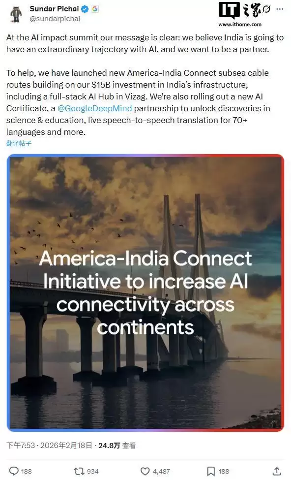这一计划是谷歌早前承诺的五年内对印度AI基础设施投资150亿美元(按现行汇率约合1037.34亿元人民币)的重要组成部分。其目标是通过建设数字基础设施并推动技能培训倡议,改善印度乃至全球范围的网络互联状况,从而在弥合“数字鸿沟”的同时,降低其向“AI鸿沟”转化的风险。