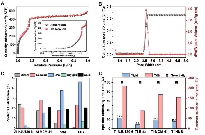 此外,NJU120-6不仅可在较宽的硅铝比范围内引入铝元素,形成Brønsted酸中心,还可通过“一锅法”将钛元素嵌入骨架,实现氧化催化活性位点的精准构筑。