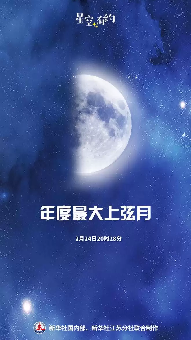 2月24日20时28分将迎来今年最大上弦月。届时,月球位于轨道近地点附近,距离地球约37万公里,这轮“半遮面”的上弦月将成为亮眼的天象景观。公众无需借助专业设备,仅凭肉眼即可欣赏。 “太阳、地