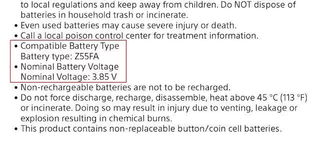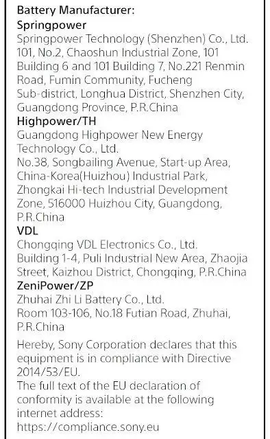 在电池规格方面,文件确认新机使用的电池型号为Z55FA,电压为3.85V,但具体容量尚未披露。索尼列出了四家电池供应商,包括Springpower、Highpower / TH、VDL以及珠海市至力电池有限公司(ZeniPower)。根据型号前缀推断,Z55FA极有可能来自ZeniPower。