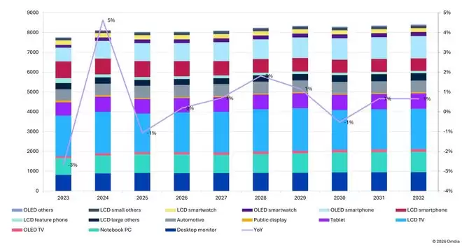 展望2026年,尽管4K+液晶电视面板出货规模有望回升,但IT与移动端显示驱动芯片的出货将受到存储器"超级周期"的制约,因此各细分市场的需求总和预计将保持平稳态势。