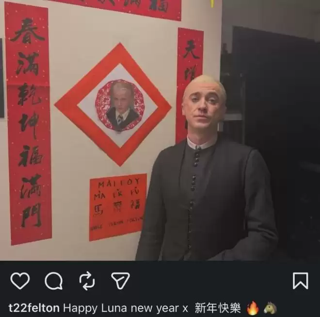 汤姆·费尔顿是电影《哈利·波特》主要角色马尔福的扮演者,因为角色谐音,一到春节,就会有中国网友和他互动,2026年是马年,汤姆·费尔顿回应了中国网友,发了“Chinese New Year”庆祝新年。