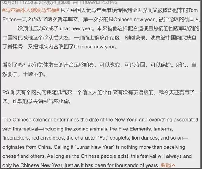 还好,在中国网友据理力争之下,汤姆·费尔顿修正了错误,改回了“Chinese New Year”。