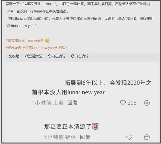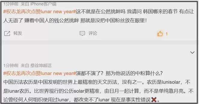 不仅如此,权志龙后续还点赞了大量使用“Lunar new year”的动态挑衅。