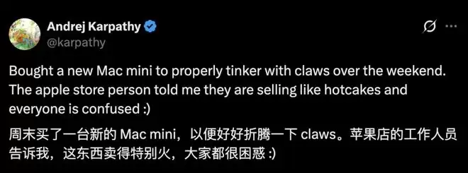 他在社交媒体上发帖:自己周末买了一台新Mac mini,准备好好折腾一番「Claws」。