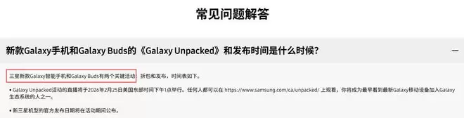 三星为不同国家和地区打造了专属的 Unpacked 发布会落地页面。其中,美国官网的页面设计较为简洁,仅设置了发布会倒计时以及新品预约入口——预约用户可享受折扣并参与抽奖活动。而加拿大三星官网的落地页面则要详细得多,其常见问题板块直接列出了本次即将发布的产品品类,其中明确包含了 Galaxy Buds 系列。