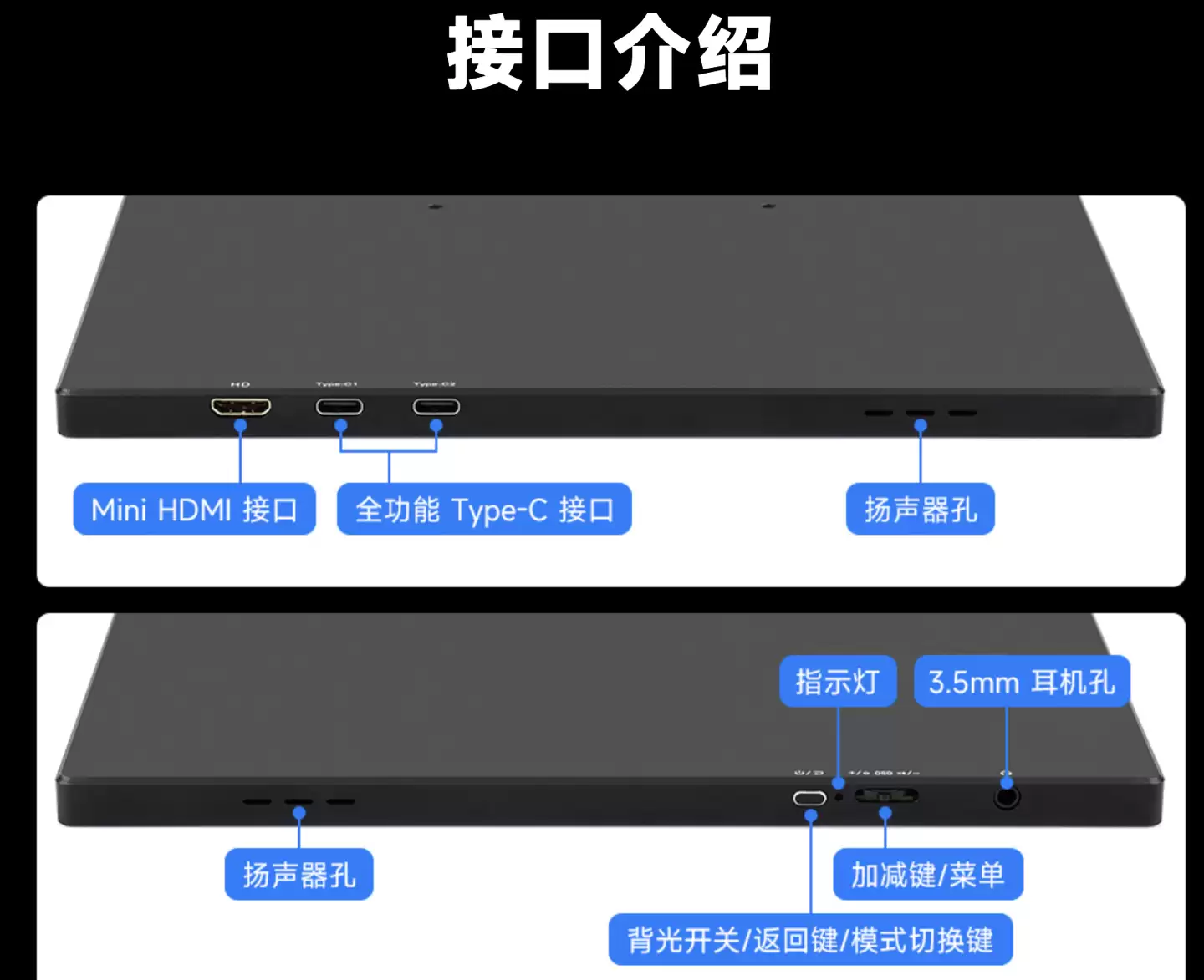 接口方面,这款显示器集成了两个USB Type-C接口和一个Mini HDMI接口。两个C口均支持音频、视频信号传输和供电功能,只需一根线缆即可连接笔记本、手机或平板电脑等设备。它也兼容树莓派5、英伟达Jetson等开发板,甚至能连接PS5、XSX等常见游戏主机。