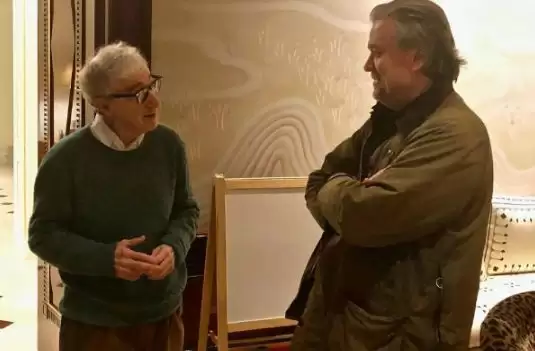 文件显示,特朗普的前首席战略顾问史蒂夫·班农(右)经常与爱泼斯坦讨论政治策略。左为伍迪·艾伦。金融时报