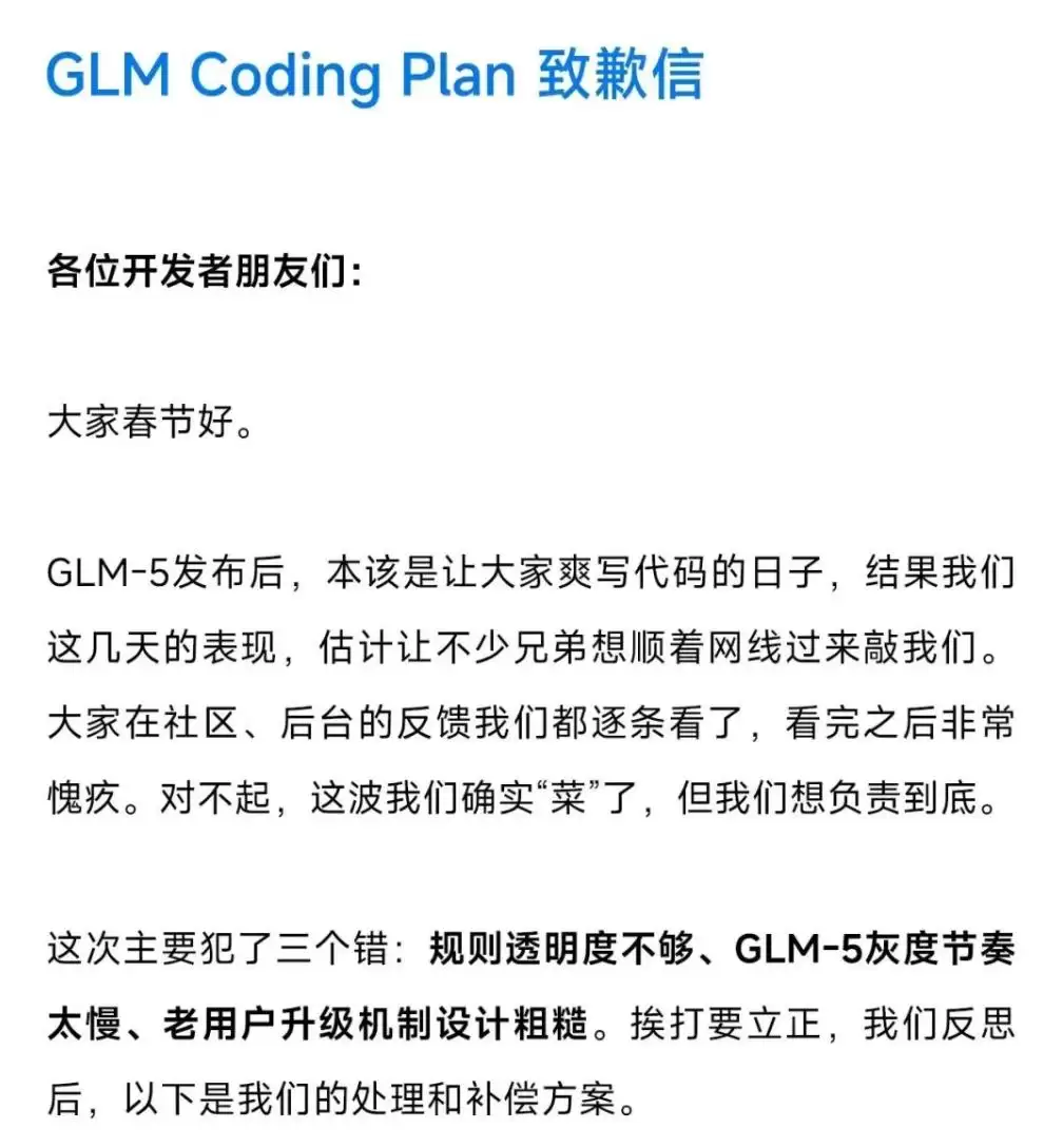 没想到,2月21日它就整了波大活,发了封致歉信,承认GLM-5发布后犯了三个错。