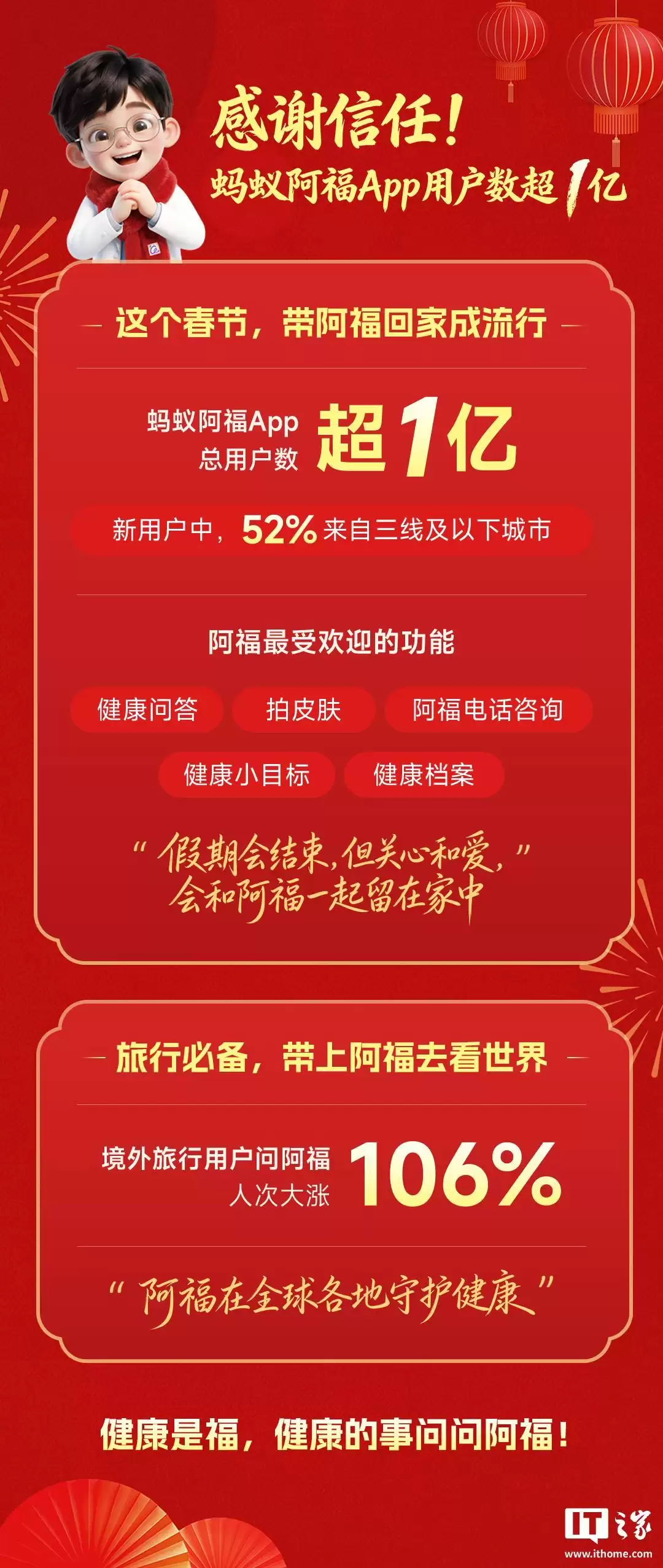 IT之家 2 月 23 日消息,蚂蚁阿福最新今日发文宣布,这个春节假期,蚂蚁阿福 App 的用户数超 1 亿。据介绍,新用户中,52% 来自三线及以下城市;最受欢迎的功能包括健康问答、拍皮肤、阿福电