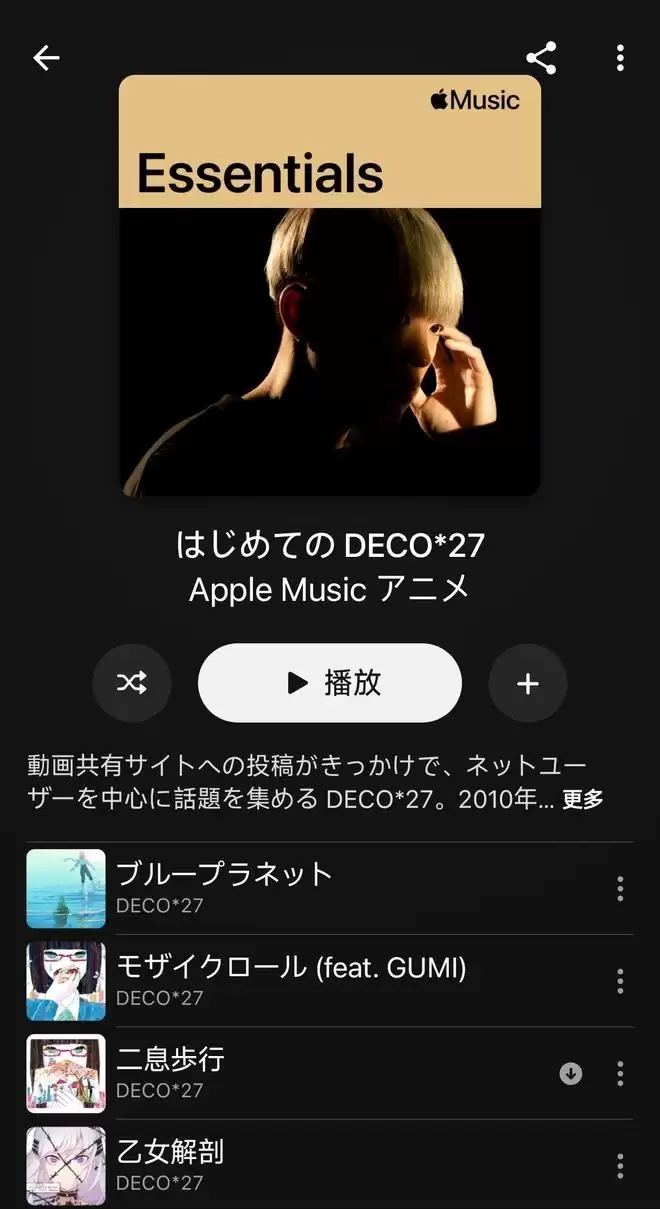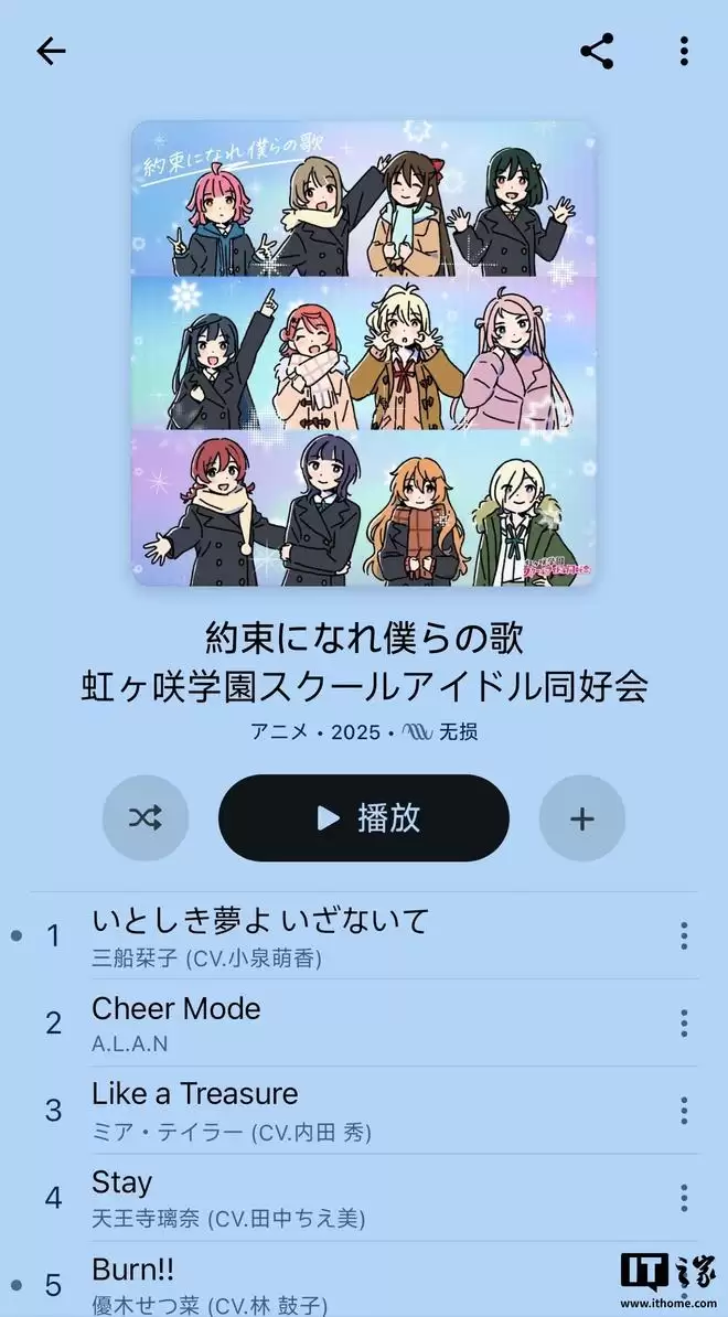 并且更新后的"播放"按钮将位于屏幕中心,而"随机播放""下载"按钮则被放置在左右两侧,右上角是分享菜单,整体逻辑更加清晰。
