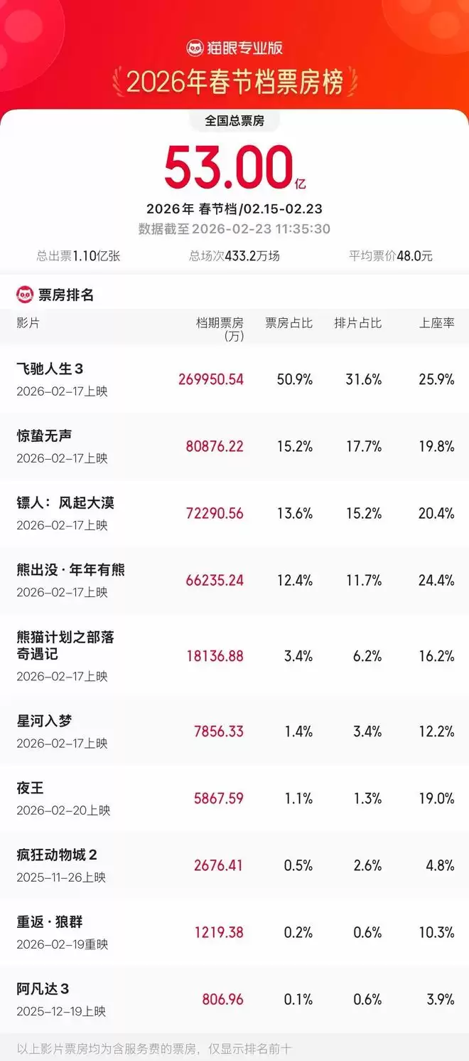 根据猫眼专业版数据统计,2026年春节档期总票房突破53亿大关,《飞驰人生3》《惊蛰无声》与《铸匠:风起大漠》三部影片位列票房前三甲。