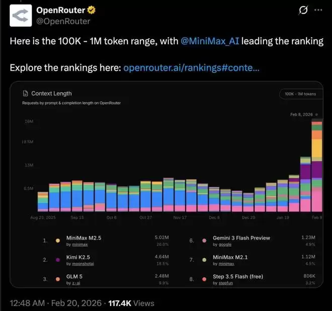 这还不是故事的全部。OpenRouter 整体调用量也在同步攀升。最新随后确认,M2.5 带动了 100K 至 1M 长文本区间的增量调用需求,而这个区间正是 Agent 工作流的典型消耗场景。