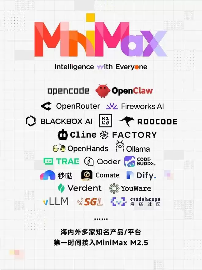 此次 M2.5 发布后随即全面开源,模型权重在 HuggingFace 上发布,支持本地部署,Kilo 再次宣布接入。与此同时,OpenCode、OpenClaw、Fireworks、Factory、TRAE、Cline、OpenHands、Roo Code,以及 Ollama、vLLM、SGLang、Dify、魔搭社区等国内外知名开源 Agent 应用、开源工具平台,也在第一时间接入