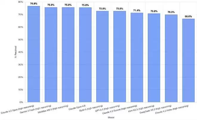 在编程领域最具代表性的 SWE-Bench Verified 评测中,M2.5 以 80.2% 的通过率达到了与 Claude Opus 系列相当的水平,在多语言任务 Multi-SWE-Bench 上排名第一。