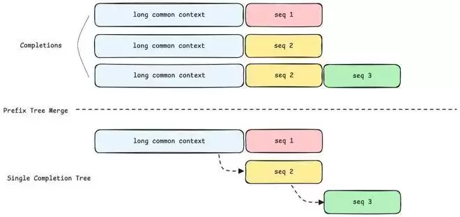 训练效率上,Forge 引入了 Prefix Tree Merging 方案,将训练样本从线性序列重构为树形结构,消除了多轮 Agent 请求之间大量重复的上下文前缀,实现了约 40 倍的训练加速,同时显著降低了显存开销。