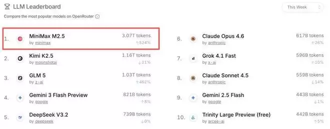 M2.5 发布后 12 小时内登顶 OpenRouter 热度榜,一周内登顶调用量榜首,周调用量暴涨至 3.07T tokens,超过 Kimi K2.5、GLM-5 与 DeepSeek V3.2 三家的总和。