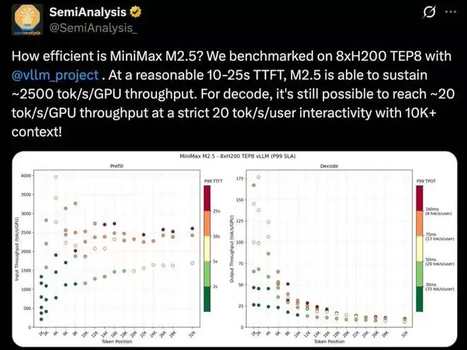 执行效率也有实质性提升。研究机构 SemiAnalysis 实测显示,在 8 张 H200 显卡上,M2.5 在合理首 token 延迟范围内能够持续达到每 GPU 每秒约 2500 个 token 的吞吐量,即便在严格要求每用户每秒 20 个 token 交互性的条件下,处理超过 1 万个 token 的上下文时仍能维持稳定的解码速度。