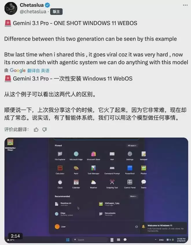 知名AI博主Chetaslua展示了其用Gemini 3.1 Pro一次性安装Windows 11 WebOS的结果。