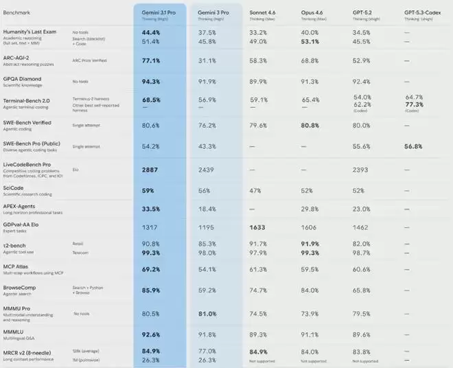 相比Gemini 3 Pro、Claude Sonnet 4.6、Claude Opus 4.6、GPT-5.2、GPT-5.3-Codex,Gemini 3.1 Pro在12项基准测试中拿下第一。