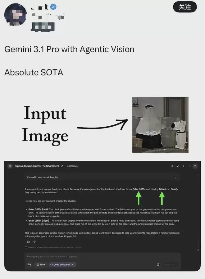 视觉理解方向的测试则进一步拉高了难度。有网友专门验证“AgenticVision”能力,输入素材是一张看似普通的街头垃圾桶照片。