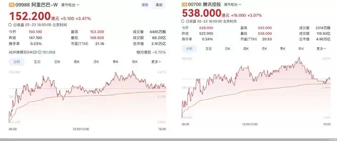 2月23日,智谱和MiniMax股价回落,当天股价分别收于560港元和840.5港元。同日,两大春节期间的AI主力阿里和腾讯股价反弹,收盘时阿里股价152.2港元,较上一个交易日收盘时的147.1港元上涨了3.47%;腾讯股价538港元,较上一个交易日收盘时的522港元上涨3.07%。