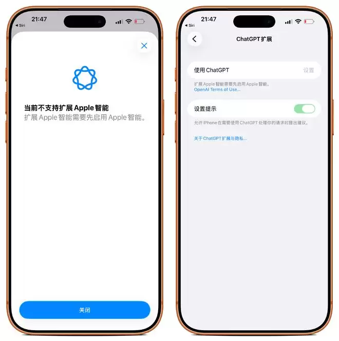 不过最近有网友发现,国行 iPhone 出现了 Apple 智能 ChatGPT 扩展的界面入口,用户可以通过对 Siri 完整说出“开启 AI 功能”来触发,这一情况引发了不少讨论。