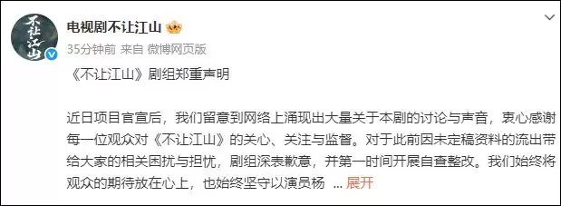未来,剧组将以更高标准严格要求自己,持续优化打磨作品,不负大家的期待。我们满怀诚意与期待,希望《不让江山》能以最用心、最完整的模样,早日与每一位喜爱它、期待它的朋友相见。