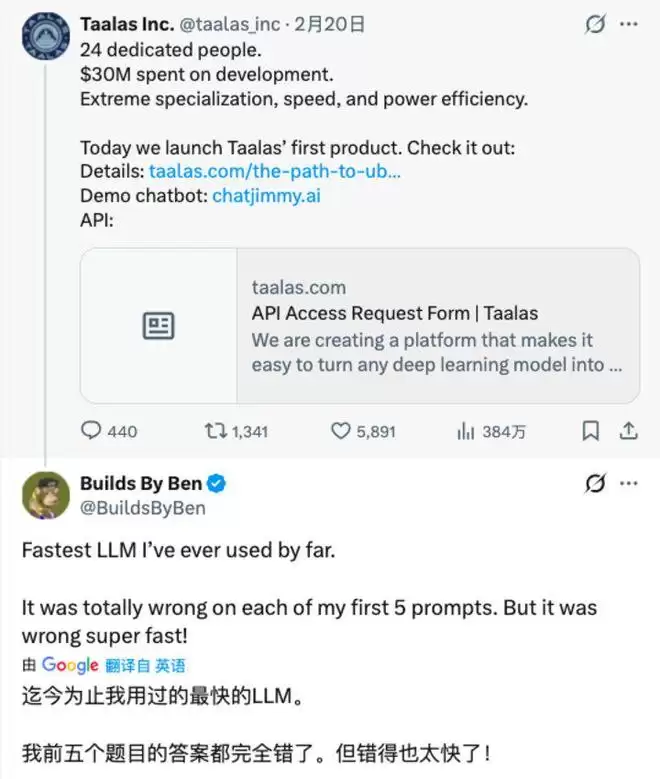 实际上,包括独立人工智能研究员本杰明·马里(Benjamin Marie)、Devtools创业顾问肖恩·王(swyx)等产业界人士和The Next Platform记者蒂莫西·普里克特·摩根(Timothy Prickett Morgan)等媒体人士,都已在积极介绍Taalas的新产品,看好其前景者不在少数。