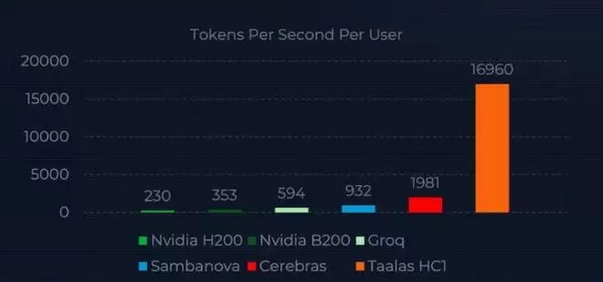 巴伊奇给出了一组测试数据,Taalas自己在Llama 3.1 8B上测试了英伟达的主力产品H200和B200,结果为230 tokens/秒和353 tokens/秒,而Taalas的HC1性能是它们的48倍。