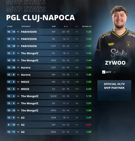 在本届赛事中,ZywOo共计出战15张地图,平均Rating高达1.39。除了小组赛首场对阵G2时,在图二仅获得0.91的Rating外,其余场次的Rating均超过1.0。在对阵MOUZ的小组赛中,他甚至在单张地图打出了2.03的惊人Rating。值得一提的是,ZywOo所有比赛的K/D差均为正数,即便在Rating数据表现欠佳的地图中,他的K/D差也能保持+1,这充分展现了其超凡的稳定性。