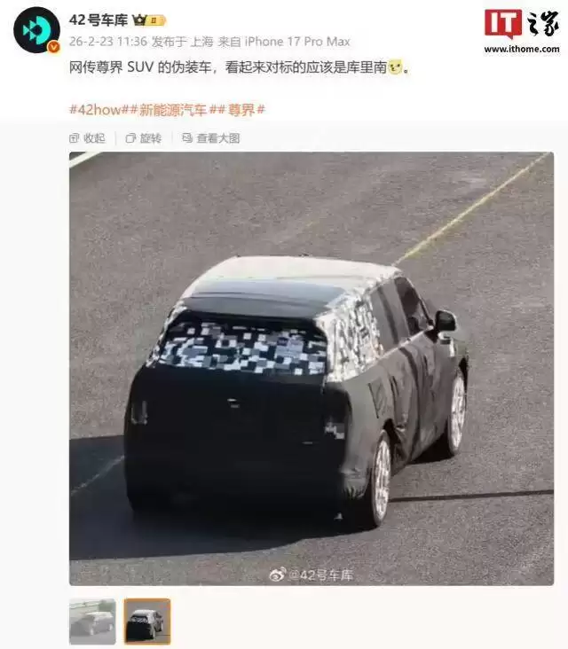 近日,知名汽车博主@42号车库在社交平台曝光了一组鸿蒙智行全新尊界SUV的伪装车照片,迅速引发汽车圈热议。从谍照来看,这款新车虽然采用了大面积伪装贴纸覆盖,但其方正硬朗的车身轮廓依然清晰可辨,整体造型更偏向MPV与SUV的跨界融合,与劳斯莱斯库里南的厚重感形成了微妙呼应。