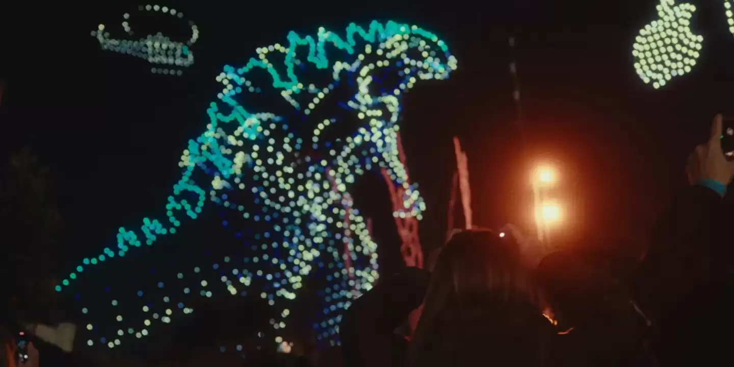 无人机群通过光点阵列,在夜空中生动再现了即将在第二季登场的哥斯拉、金刚以及全新怪兽“泰坦X”。以哥斯拉为例,其在“传奇怪兽宇宙”中的设定身高介于355英尺至393英尺(约108.2米至119.8米)之间,而此次表演完美还原了这一庞大体型。