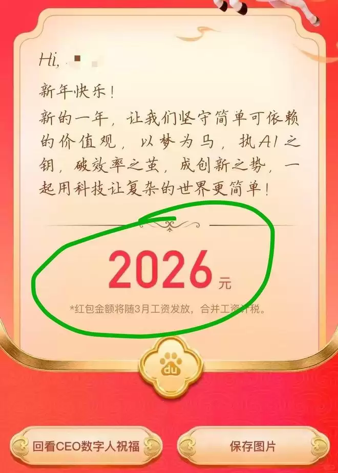 2月24日,开工首日,百度通过创始人李彦宏的数字人为每位员工发放开工随机红包,红包金额涵盖了365元、588元、666元、888元及2026元等多种面额。员工有机会领取最高达2026元的超值开工红包,实习生也能获得188元的开工好礼。