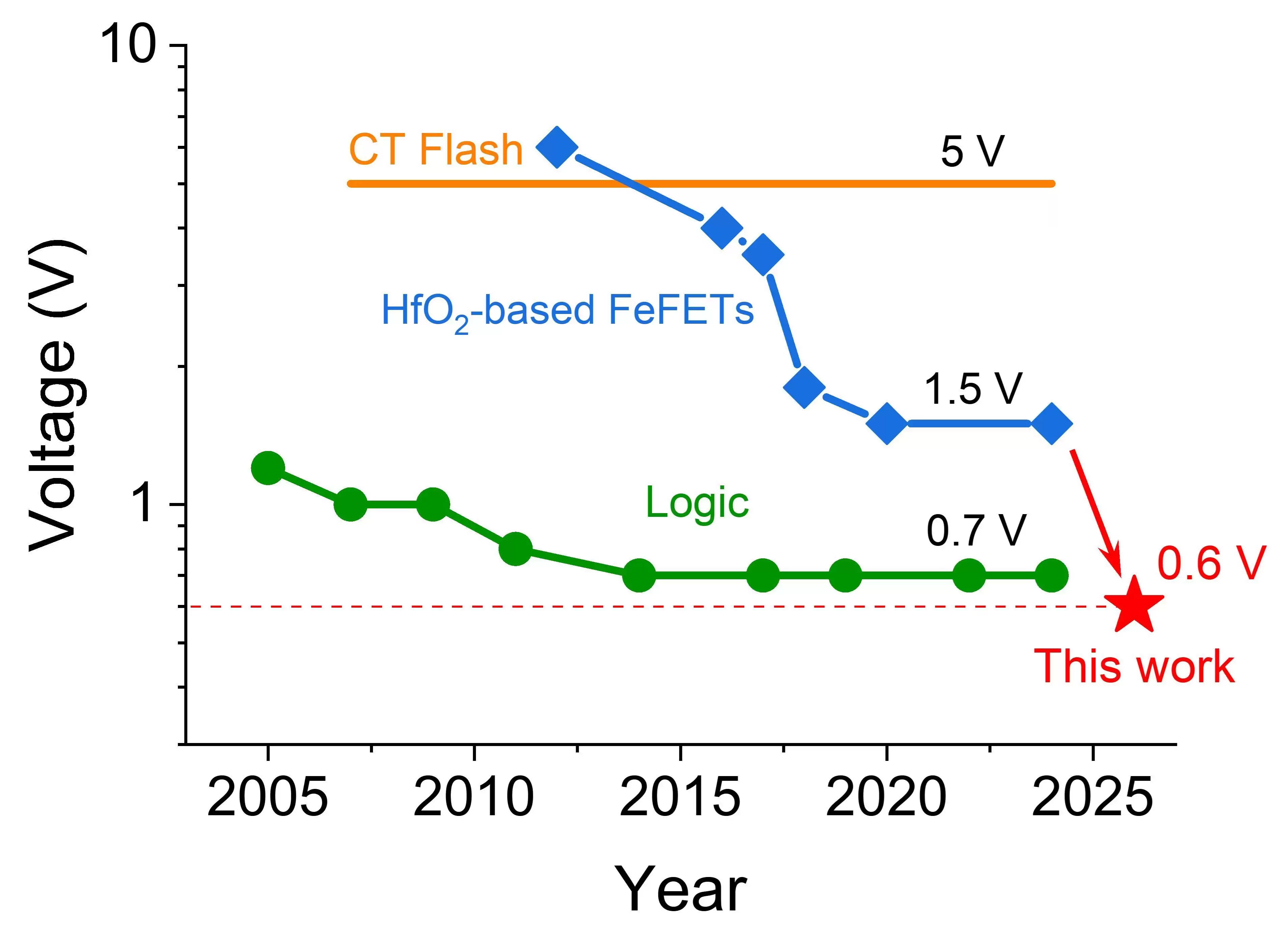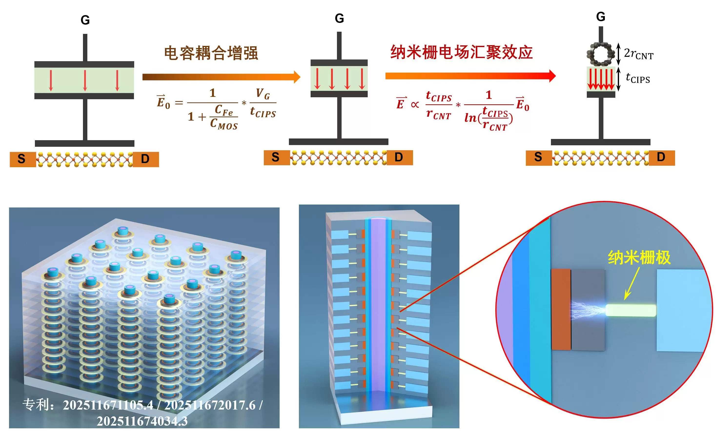 然而,传统铁电晶体管存在能耗过高、逻辑电压不匹配等短板,限制了大规其模应用。为此,北京大学邱晨光研究员与彭练矛院士团队协作,巧妙利用纳米栅极结构设计,解决了铁电材料“改变极化状态”需要高电压、高能耗的关键难题。