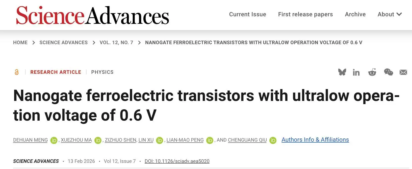 快科技2月24日消息,北京大学宣布,该校团队迎来芯片领域重大突破,成功制备出迄今尺寸最小、功耗最低的铁电晶体管。相关研究成果发表于《科学·进展》,为下一代高算力AI芯片发展奠定关键技术基础。该团队创