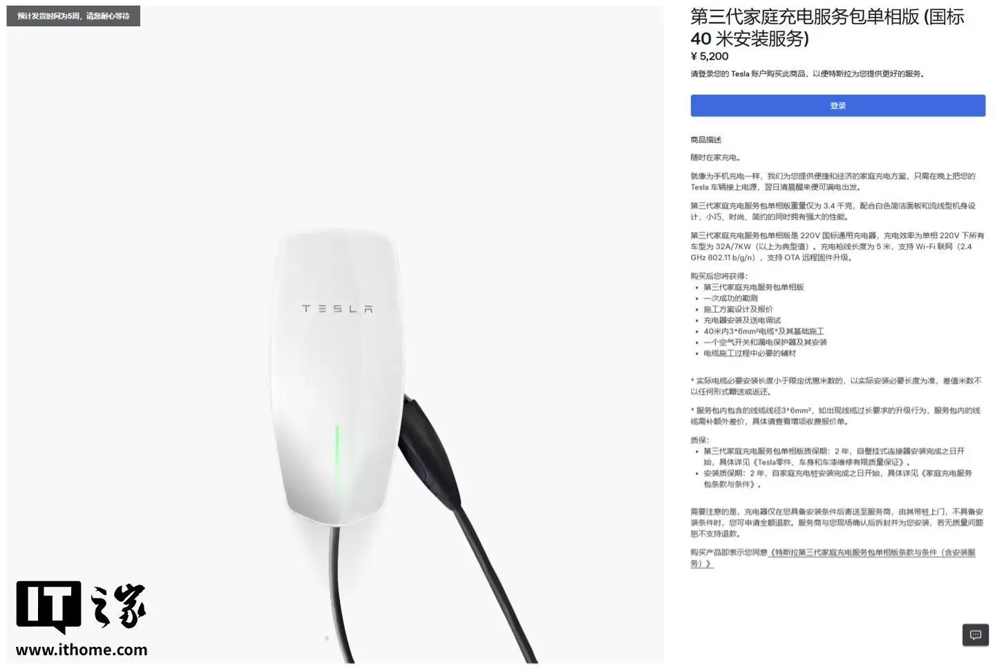 目前,特斯拉官方已正式开售第三代家庭充电服务包单相版。该服务包包含国标40米安装服务,定价为5200元。具体产品与服务内容涵盖: