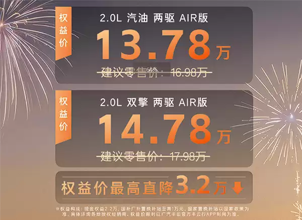 广汽丰田全新威兰达AIR版今日正式登陆市场,作为新一代车型的入门版本,其最新指导价区间为13.78-14.78万元,相比此前16.98万元的起售价直降3.2万元。这一价格调整得益于现金优惠、国家补贴及厂家补贴的叠加效应,创下该车系价格新低。新车同步推出限时购车权益,包括2099元享4次原厂保养的直销套餐,以及首付1.46万元、月供1650元的8年超长期低息金融方案。