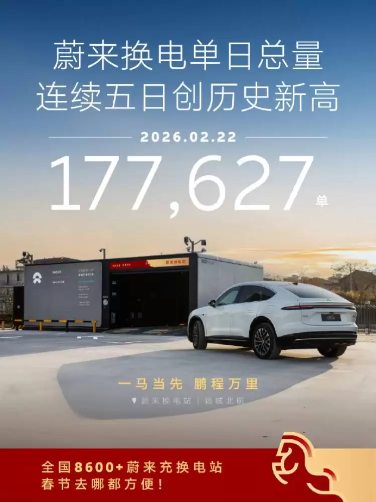 蔚来换电服务在春节返程高峰期间迎来历史性突破。2月22日(大年初六),蔚来单日换电总量达177,627次,平均每0.5秒就完成一次换电操作,创下品牌运营以来的最高纪录。当天,高速公路服务区换电站表现尤为突出,单日换电单量前三的站点均位于高速路段,其中最高单站换电量达191次,有效缓解了返程车流的充电压力。