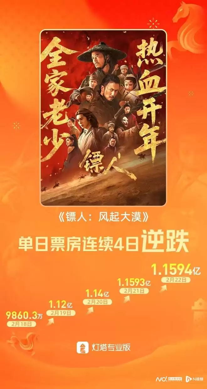 本届春节档最大的惊喜,当属位列票房第三位的《镖人:风起大漠》。该片以8.06亿元的档期票房,实现了从上映初期的不被看好到跻身前三的华丽逆袭,更创下自2月19日起连续4天票房逆跌的佳绩,成为这个春节档口碑驱动票房的典范。