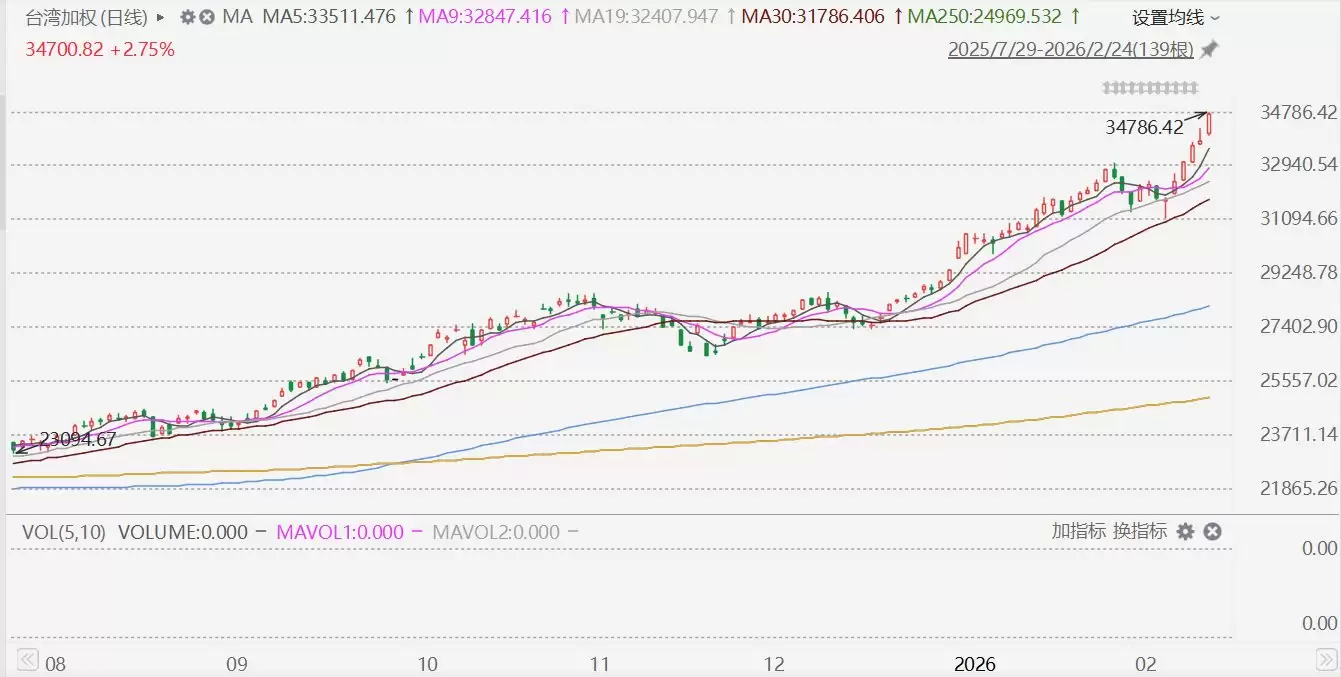 台股加权指数在2月24日盘中一度冲高3%,站上34786.42点,刷新历史纪录;终场收涨2.75%,报34700.82点,实现连续五个交易日上涨,收盘点位同样创下历史新高。今年以来,台湾加权指数累计涨幅已达19.81%。