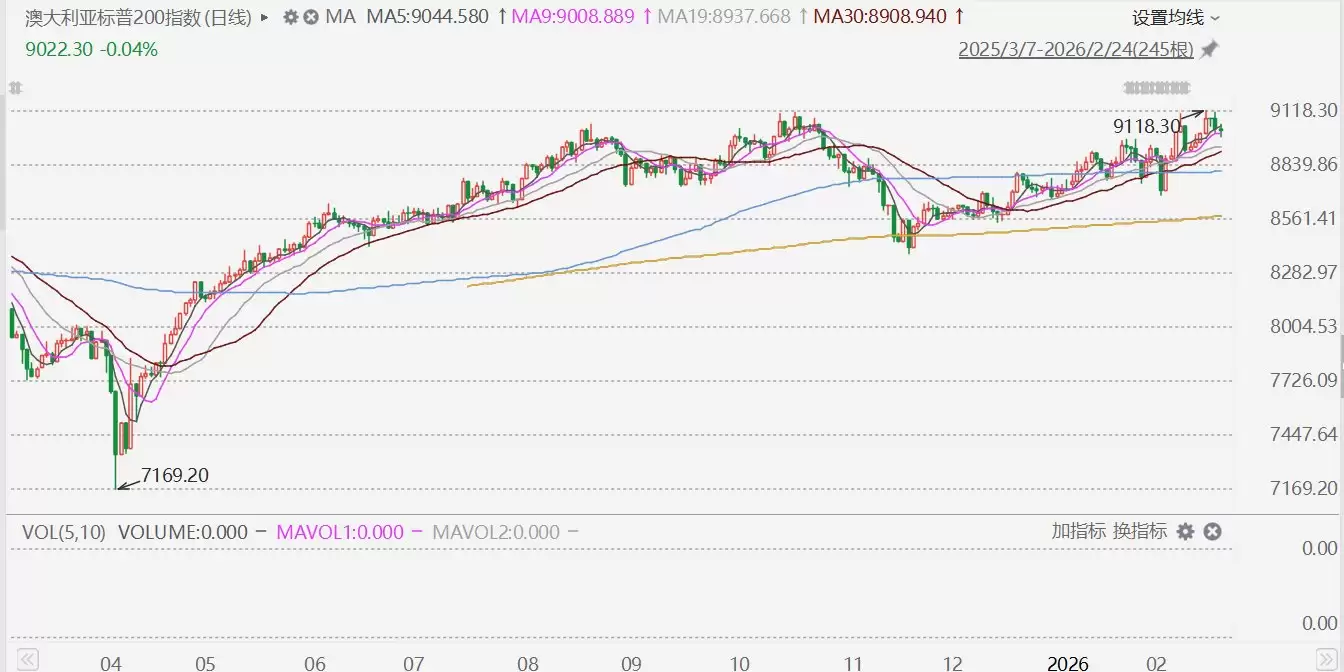 在2月24日的交易时段,澳大利亚标普/澳交所200指数收盘时小幅下滑3.70点,跌幅为0.04%,最终报收于9022.30点。