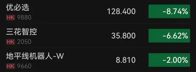 机器人板块集体走弱,优必选跌幅超过8%,三花智控跌逾6%,地平线机器人下跌2%。
