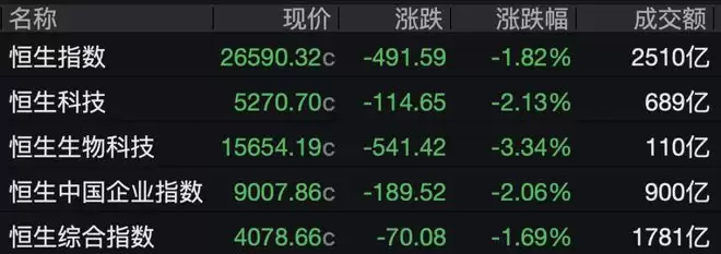 2月24日,香港恒生指数收盘下跌1.82%,恒生科技指数跌幅达2.13%。