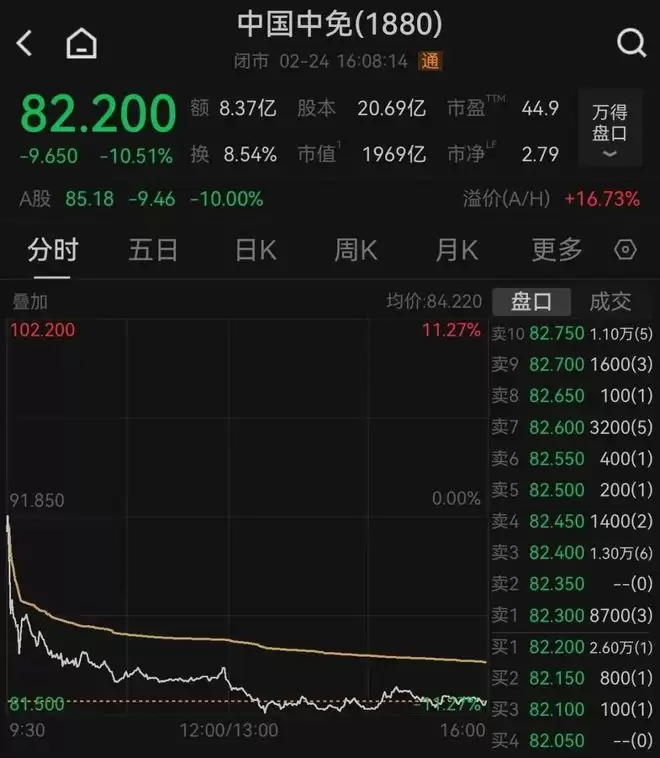 免税板块走势低迷,中国中免股价下跌逾10%。